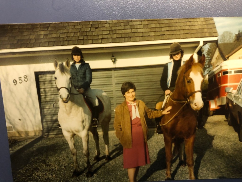 This was beyond a little girl’s dream of owning a pony, this was the real thing. Marie had only two types of clothing during those years: barn clothes and school clothes. The whole family, well, minus big brother who by this time was living his own dream as a young military officer, participated in the daily routines of horse care: feeding, turning out, mucking out, grooming, and riding. The riding was most days with trail rides that as an adult Marie shakes her head at as what now she’d consider risky riding in risky places – crossing highways to get to the beach, riding in dusk with no reflective gear on country roads, riding bareback and sometimes helmetless, galloping on the edges of farmers’ fields. Tangled up in the errant memories are slumber parties in the hayloft, organizing gymkhanas for the neighbourhood kids, horse shows that ran the gamut from down the road to across the border, Pony Club sleepover camps in the summer, and throwing dried road apples at each other in games of tag.